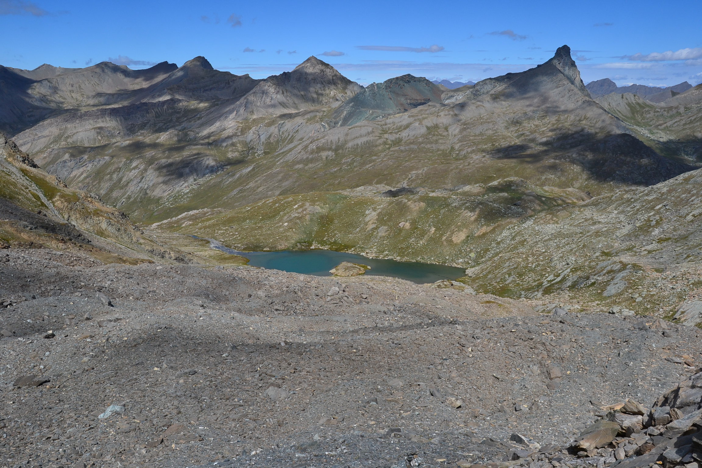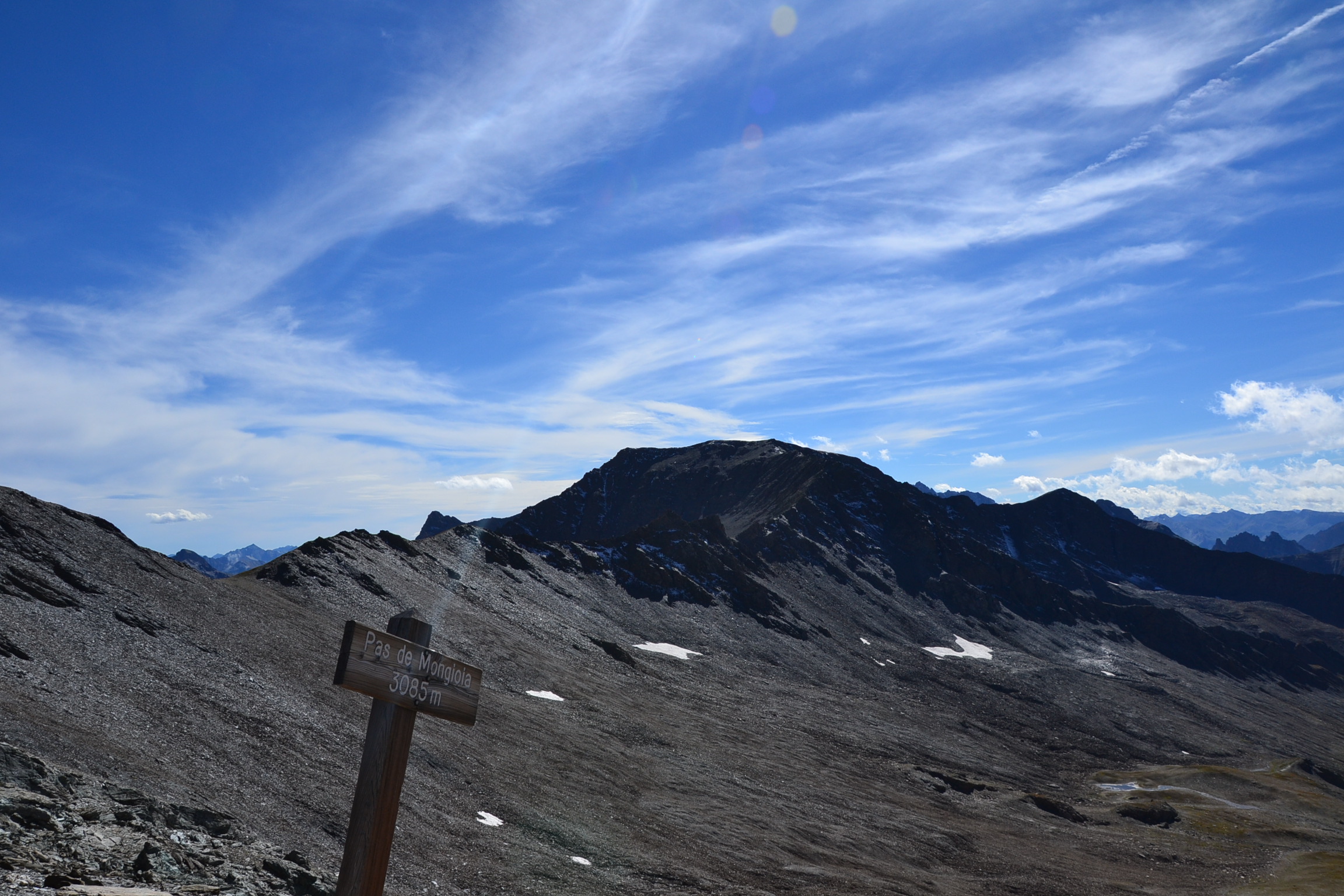 Après la cabane, le sentier redescend vers le torrent de Rubren, le traverser et remonter en rive gauche, par une montée plus raide. Puis, après la traversée d’un plateau vallonné, offrant une très belle vue sur le Bric de Rubren et les sommets alentours, il ne vous reste alors plus que les quelques 150 m de montée bien raide jusqu’au pas de Mongioia. La vue sur le versant italien, une fois au col vaut largement ces derniers efforts. Ça y est vous êtes arrivés…