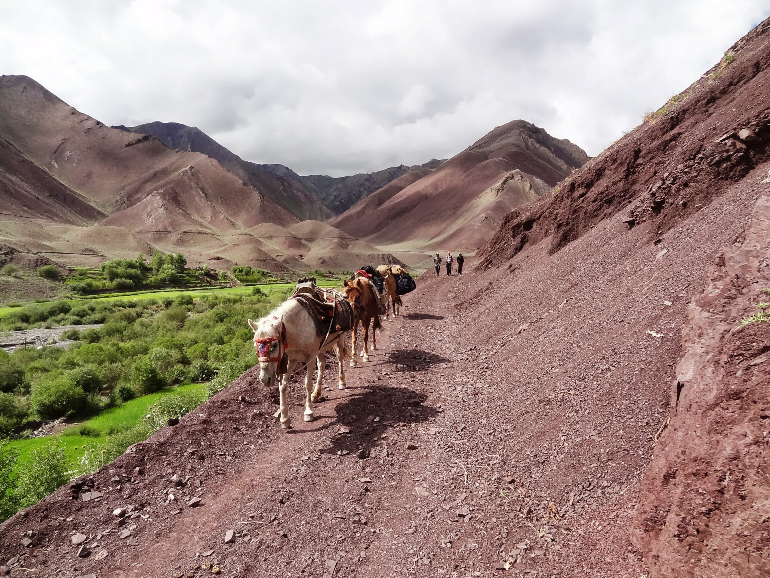 Le trek se poursuit à pas de cosmonautes dans des paysages splendides rythmés par le passage des caravanes de chevaux pour atteindre Skyu. Sur la route nous franchissons un col à 4900m : le Ganda La. Pour notre vision alpino-centrée cela est assez étrange de dépasser l’altitude du Mont-Blanc et d’être encore dominées de nombreux sommets, semblant rigoler de nos repères de sommet de l’Europe.