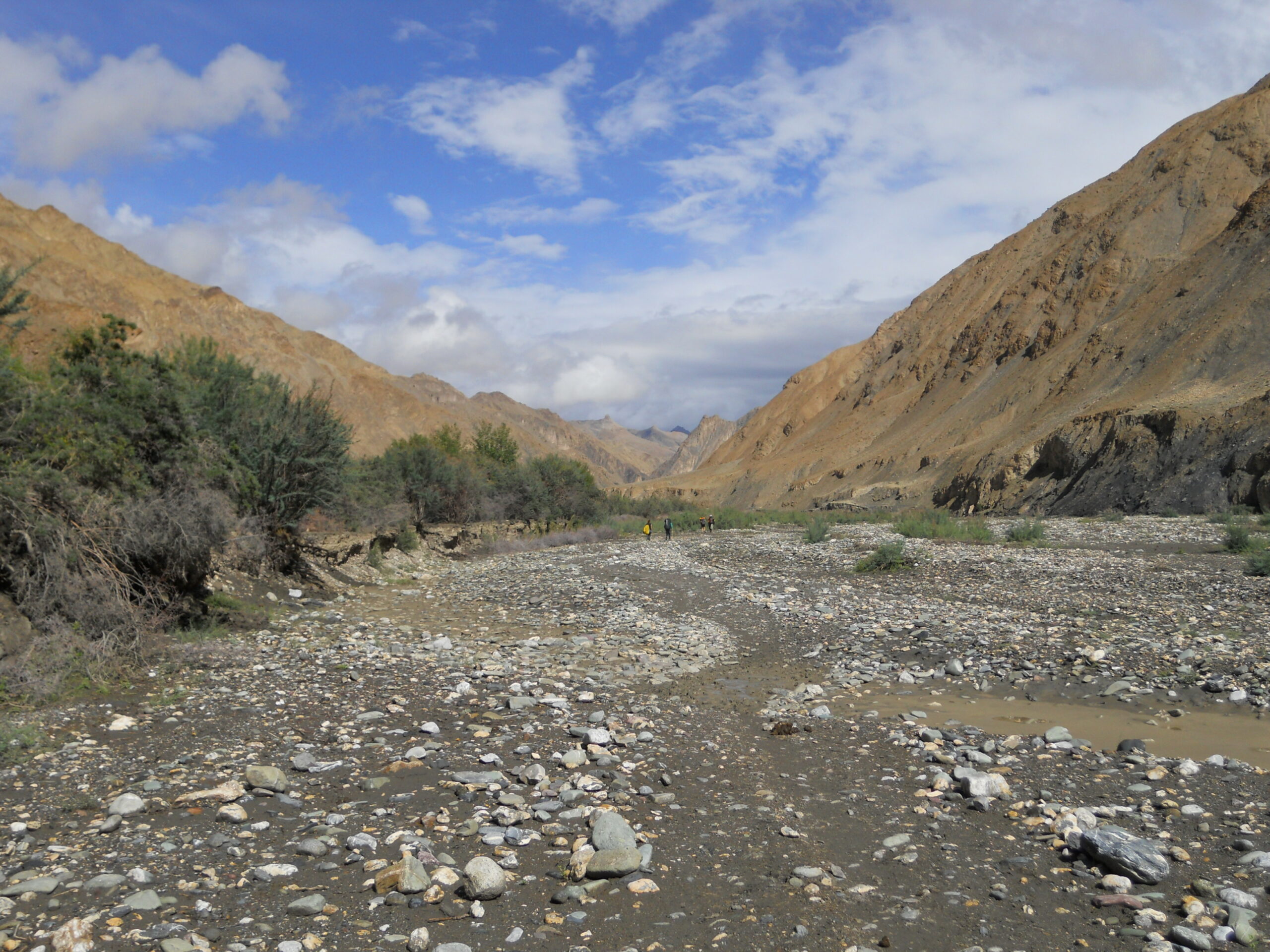 Chaque jour est un nouveau départ et le temps s’étant stabilisé, nous laçons nos chaussures et remontons la rivière de la Markha. Nous franchissons ses très nombreux affluents, bien souvent seulement aidées de nos jambes, du fait de l’absence de pont… Au moment de la traversée la plus engagée, nous nous rappelons que quand même, le pont est une invention des plus ingénieuses et bien utile et aurait évité à Marine de frôler de près la douche intégrale! De même il est assez étonnant de découvrir à deux heures de marche du plus proche village des tentes proposant du thé, dont le fameux « Milk tea », un thé au lait sucré, que nous avons consommé quotidiennement tout au long de nos arrêts.
