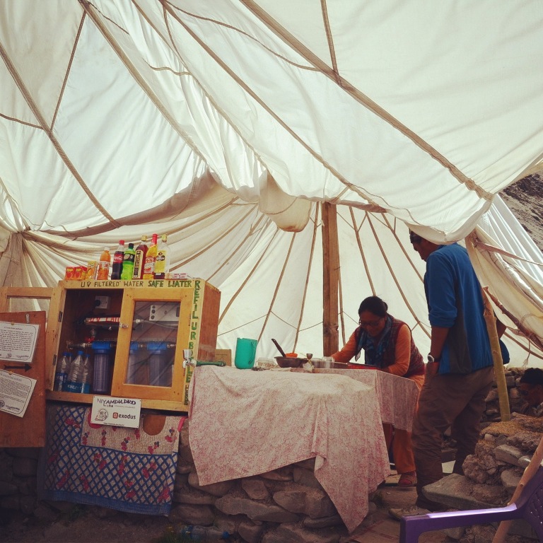 Durant l’étape suivante nous montons facilement jusqu’au camp de Tchatchuntse par un très beau sentier. Le chemin est, comme depuis le début du trek, jalonné de Stupa, structures sacrées bouddhistes que l’on doit impérativement contourner par la gauche. Le camp de tentes militaires nous permet de ne pas dormir à la belle étoile et de donner un abri à nos têtes remplies d’images magnifiques.