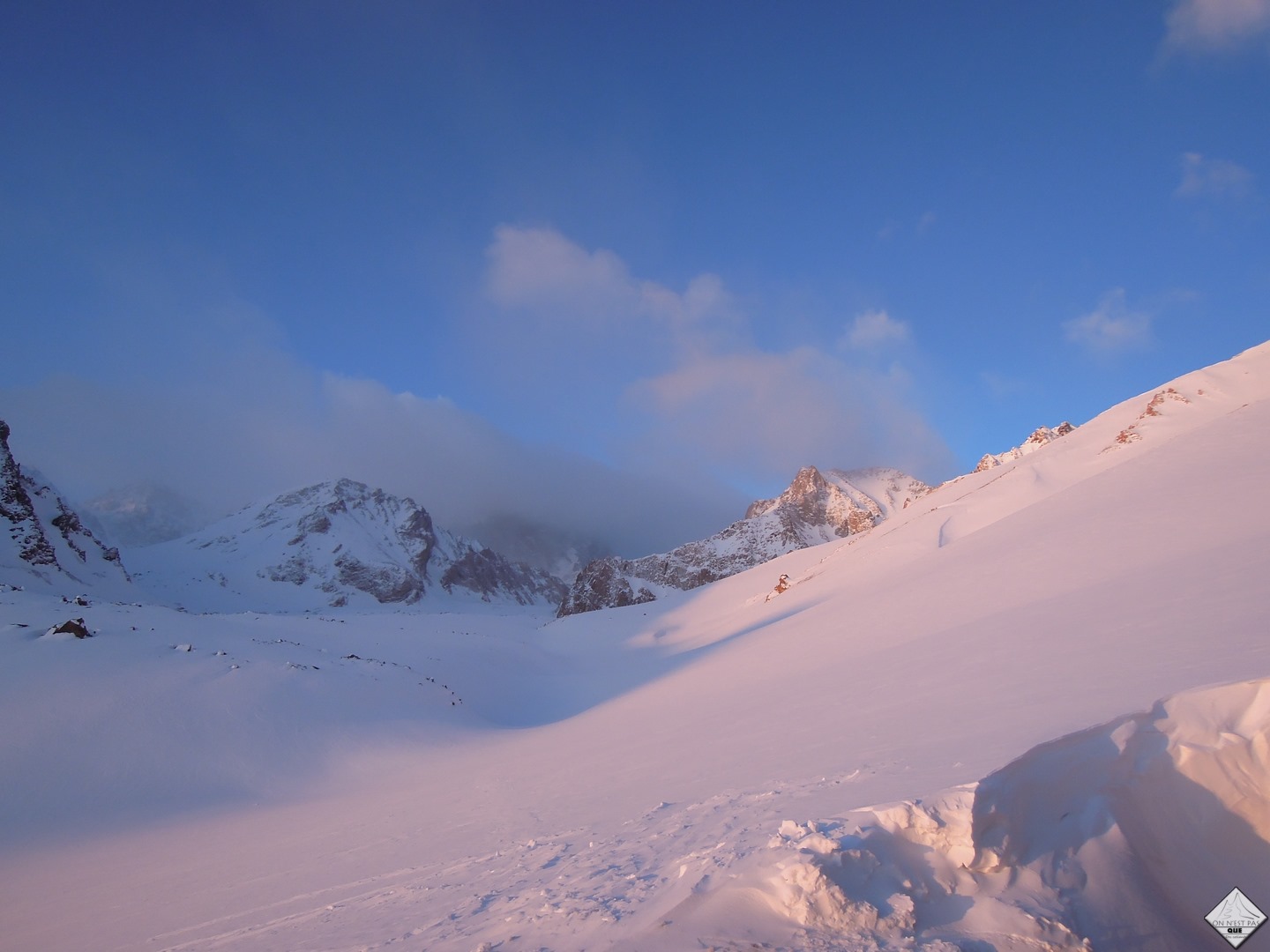 Nos premiers jours sur place nous offrirent une faible visibilité aussi bien devant nous que sur les pentes alentours que nous n’avions pu observer en arrivant à cause du mauvais temps.