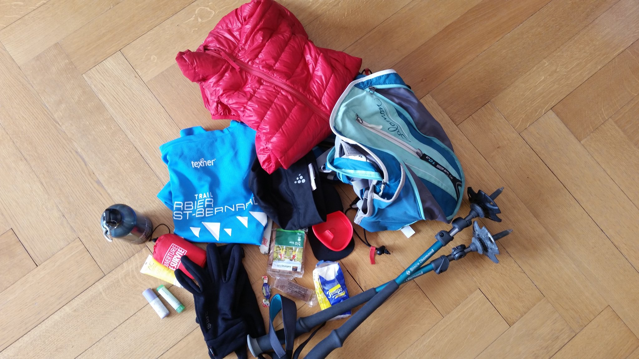 Le contenu de base de mon sac de rando-course (trail) avec un tshirt de rechange, une couche chaude, un bonnet, des gants, une pâte de fruits, des noix ou un « biberli » (pain d’épices fourré aux amandes), une gourde,
