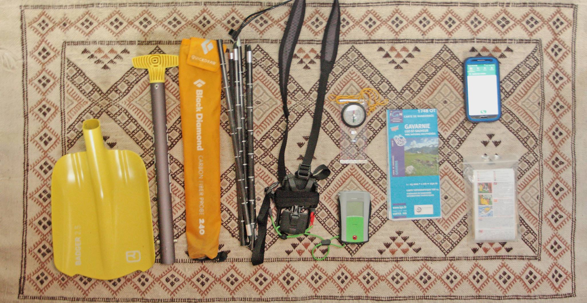 Mon sac habituel pour le moment, et j’espère jusqu’à la fin du mois d’avril, c’est le sac “ski de randonnée”..DVA, pelle, sonde, CARTE, boussole, altimètre, casque et téléphone, font partie de la base. J’ai toujours une petite doudoune dans le fond du sac et des moufles car je suis une grande frileuse, surtout au pique-nique. Et j’ai aussi la plupart du temps un petit sac de cannelés que je prépare pour mes copains…